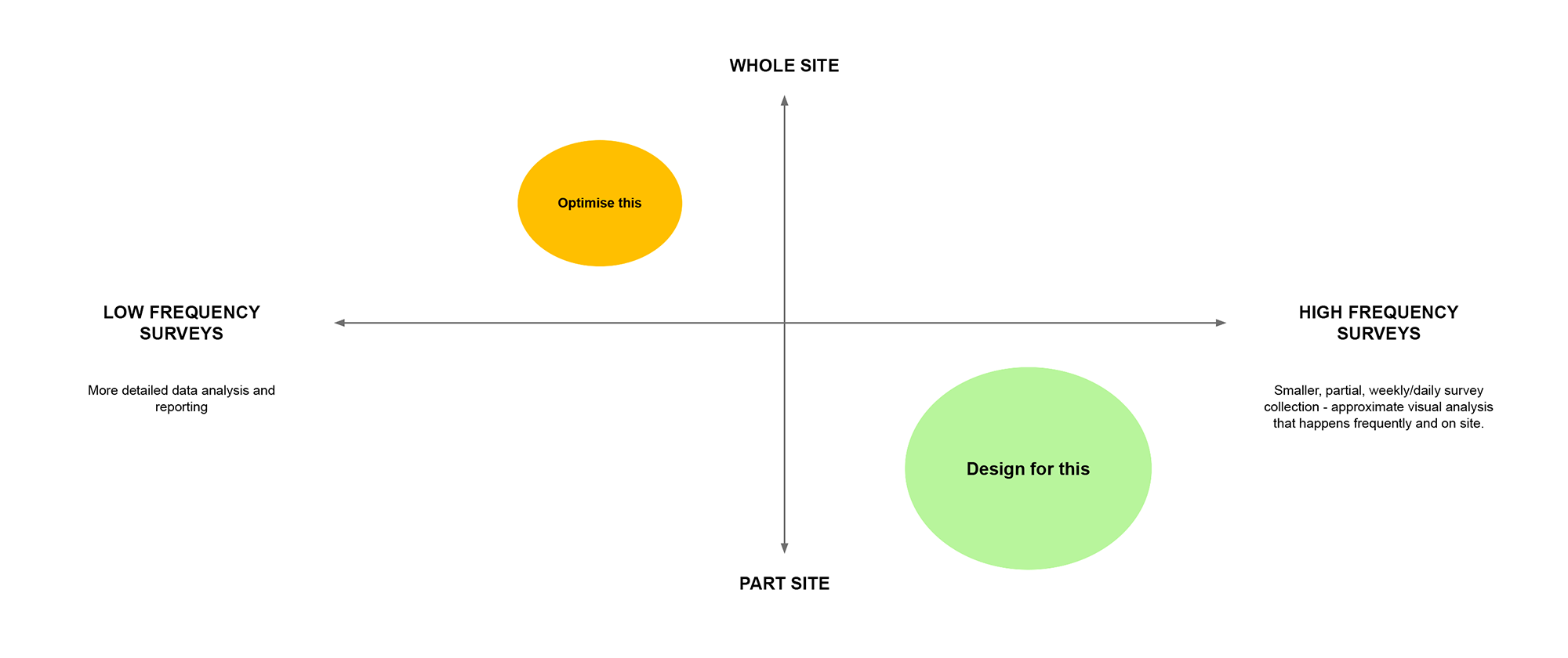 Site-wide optimisation, less frequent surveys: This method aimed to enhance the efficiency and efficacy of geospatial surveys across sites, done less often. It included thorough data analysis and reporting to streamline the process for thorough data gathering, crucial for future planning and decision-making.